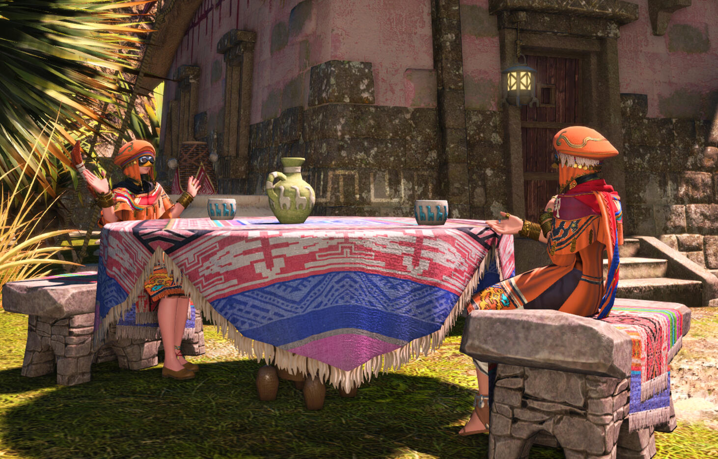 Tucked beneath a colorful canopy of woven shadecloth and windchimes, you’ll find two displays, side by side, slightly mismatched, and utterly impossible to ignore. One smells like heaven. The other? Like trouble... in the best way.🔸 On the left: The Pachamama Blendery, where Jipli peddles perfumes, incense, and oils with a nose like no other. Thanks to his rare aetherscent, his blends hum with emotion, memory, and maybe a tiny touch of experimental chaos. Every sniff's an adventure.🔸 On the right: The Sun's Embrace Distillery, the pride of a thousand sun-soaked agave fields. Here, Kaplu serves up small-batch mezcal that’s equal parts tradition and trickster. Her mystery flights are infamous: smooth going down, unpredictable after.Together, they bring you a marketplace of marvels.Aromatics that dazzle the senses, and spirits that might just speak to yours (or make you speak fluent Mamool Ja).Come for the scent, stay for a sip, and don’t be surprised if you leave with a story.